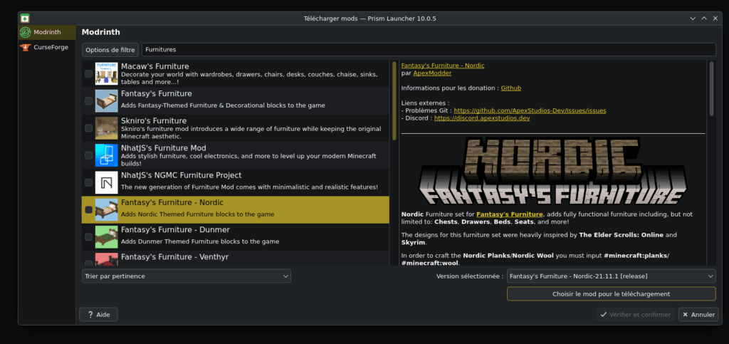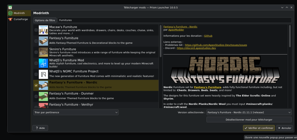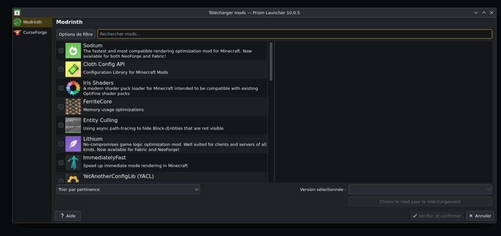Sur la droite vous voyez deux boutons : Modrinth et Curseforge. Rechercher votre mod dans l’un et passez a l’autre si vous ne le trouvez pas.